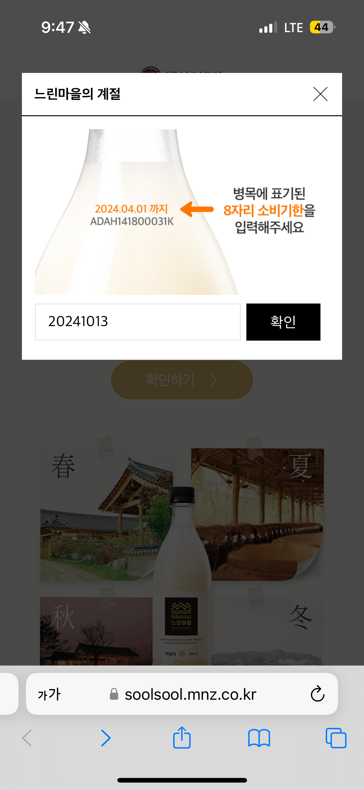 10월 5일에 유통기한 10월 13일자 느린마을 막걸리는